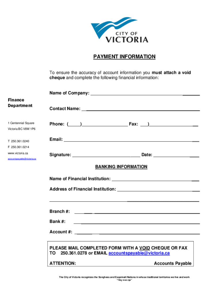 PAYMENT INFORMATION To ensure the accuracy of account information you must attach a void check and complete the following financial information:Name of Company: Finance Department1 Centennial SquareContact