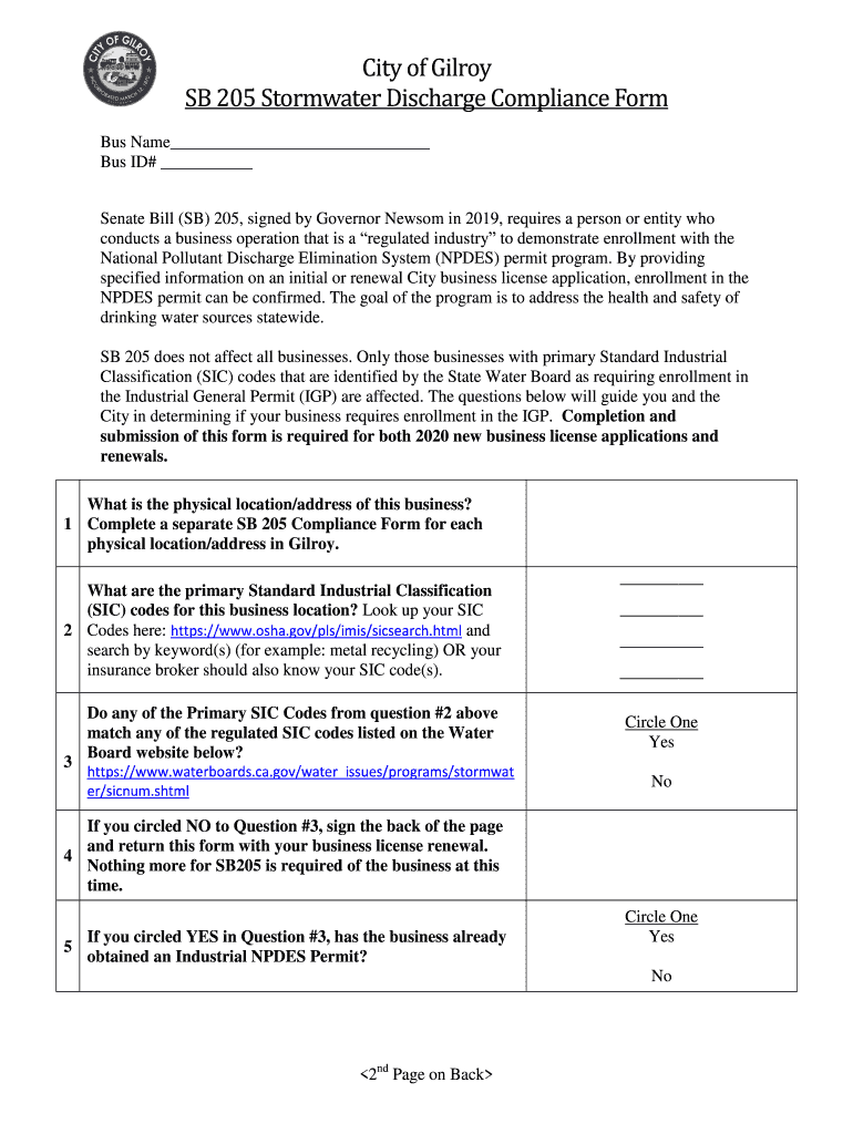 City of Gilroy SB 205 Stormwater Discharge Compliance Form Bus Name Bus ID# Senate Bill (SB) 205, signed by Governor Newsom in 2019, requires a person or entity who conducts a business operation that