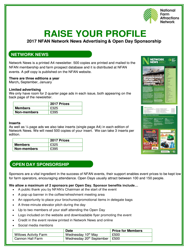 RAISE YOUR PROFILE 2017 FAN Network News Advertising & Open Day Sponsorship NETWORK NEWS is a printed A4 newsletter. 500 copies are printed and mailed to the FAN membership and farm prospect database,