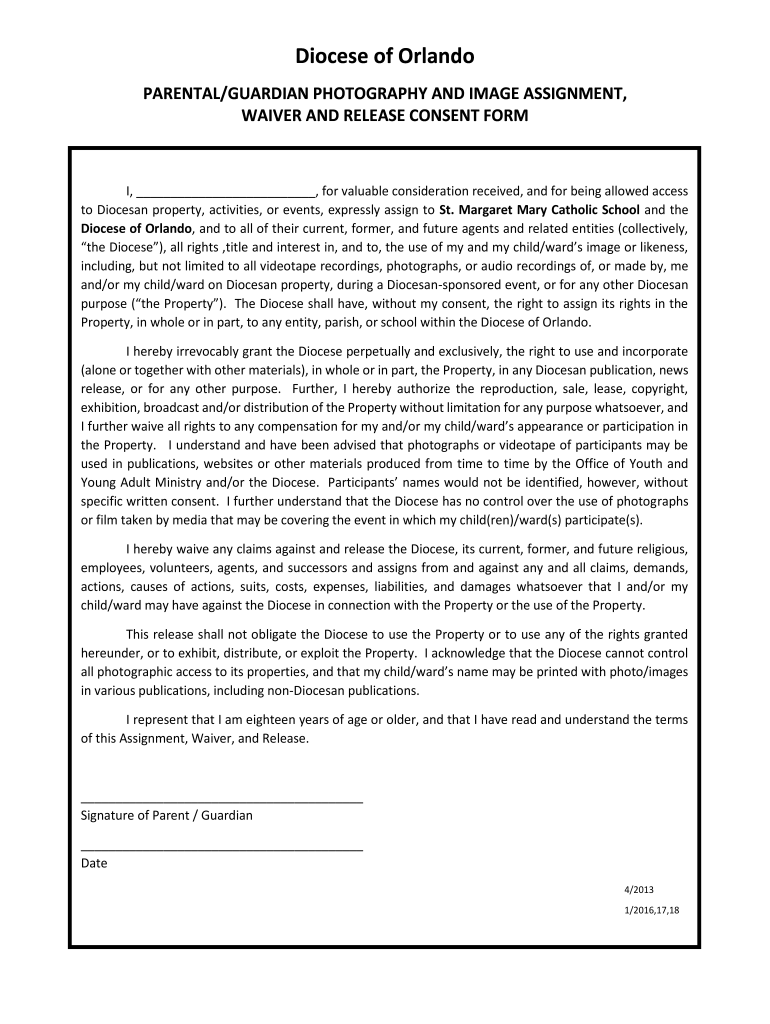 Diocese of Orlando PARENTAL/GUARDIAN PHOTOGRAPHY AND IMAGE ASSIGNMENT, WAIVER AND RELEASE CONSENT FORM, for valuable consideration received, and for being allowed access to Diocesan property, activities,
