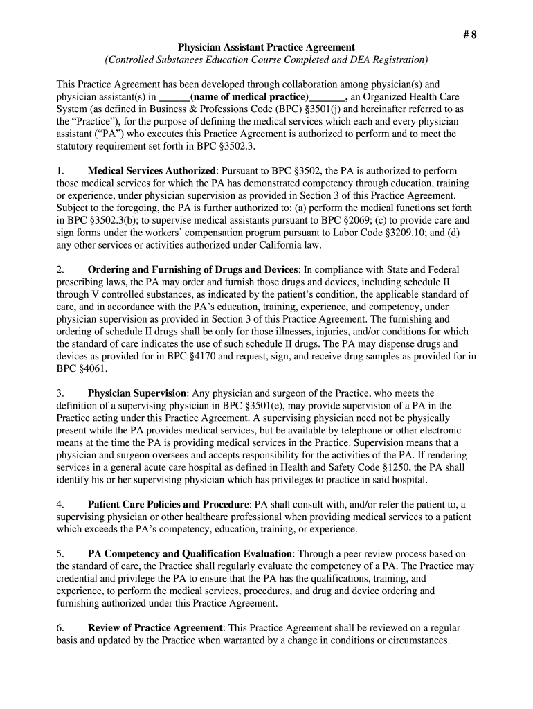 #8 Physician Assistant Practice Agreement (Controlled Substances Education Course Completed and DEA Registration) This Practice Agreement has been developed through collaboration among physician(s)