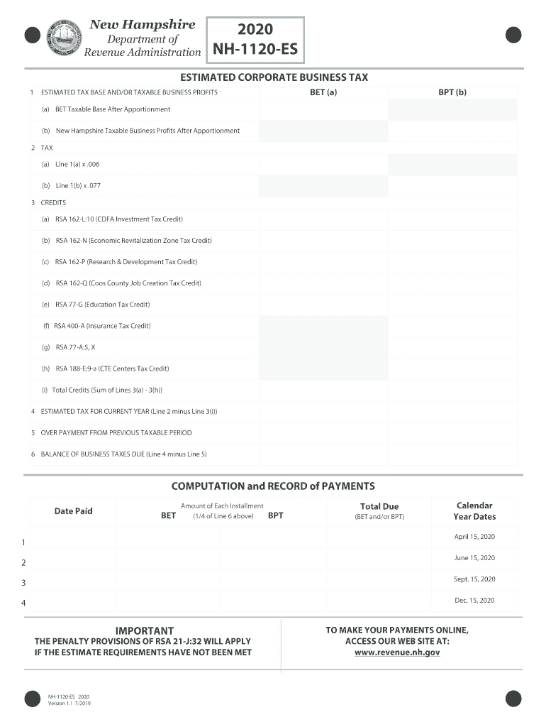 Businesses must report their estimated income, deductions, tax credits, and payments on nh-1120-es.