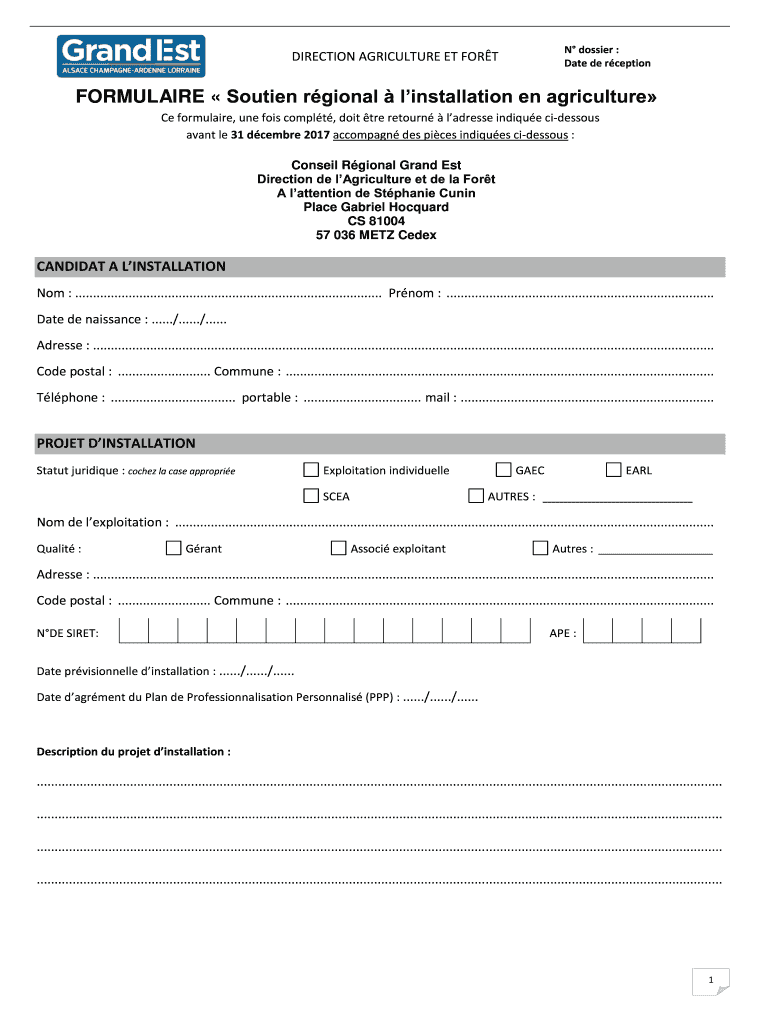 N dossier : Date de rceptionDIRECTION AGRICULTURE ET FORTFORMULAIRE Southern regional installation en agriculture Ce formula ire, one foil comply, dot TRE return lacrosse unique hideous savant LE