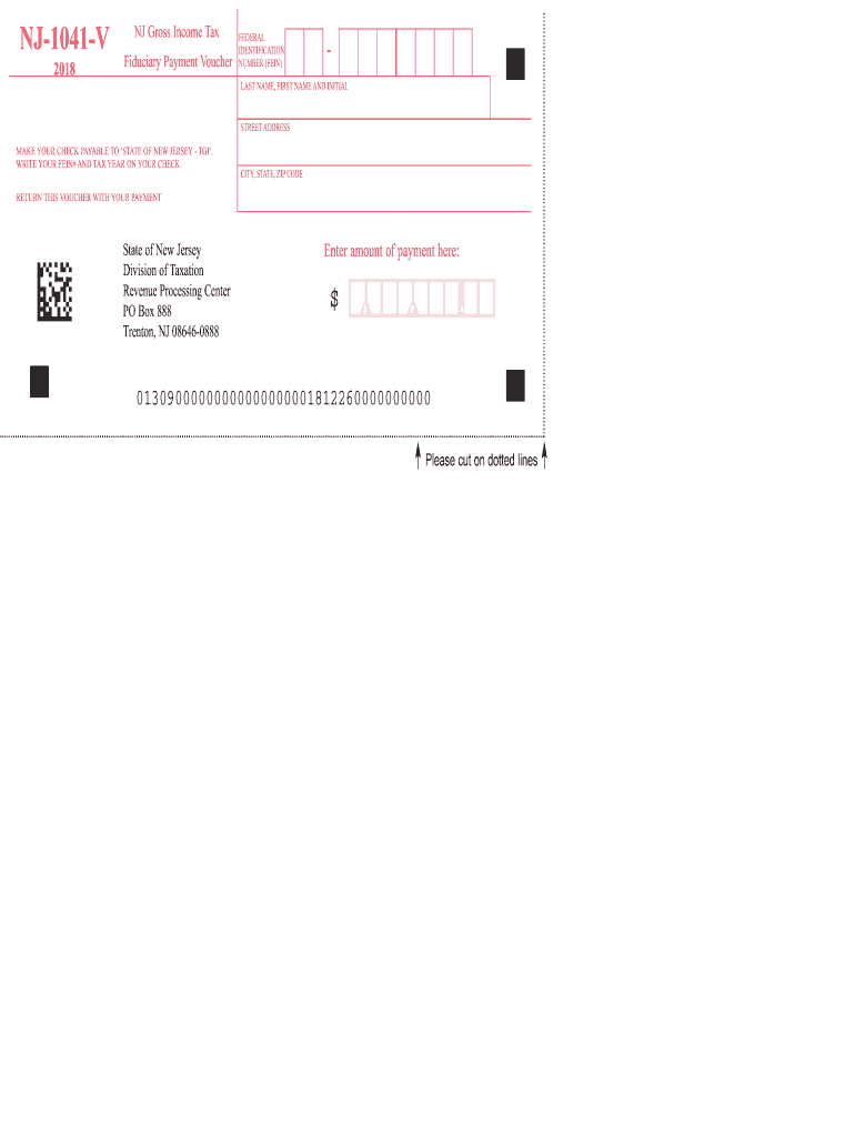NJ1041V 2018NJ Gross Income Tax Fiduciary Payment VoucherFEDERAL IDENTIFICATION NUMBER (VEIN)LAST NAME, FIRST NAME AND INITIALSTREET ADDRESS MAKE YOUR CHECK PAYABLE TO STATE OF NEW JERSEY TGI. WRITE