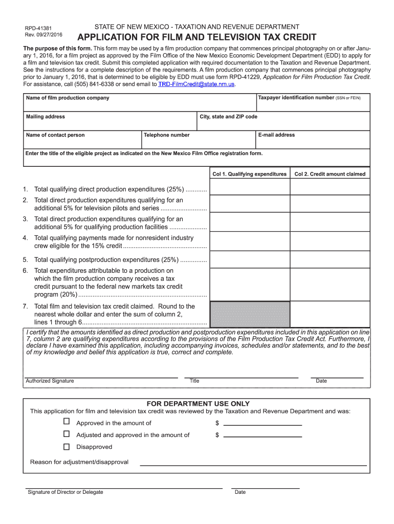 RPD41381 Rev. 09/27/2016STATE OF NEW MEXICO TAXATION AND REVENUE DEPARTMENTALIZATION FOR FILM AND TELEVISION TAX Credit purpose of this form. This form may be used by a film production company that