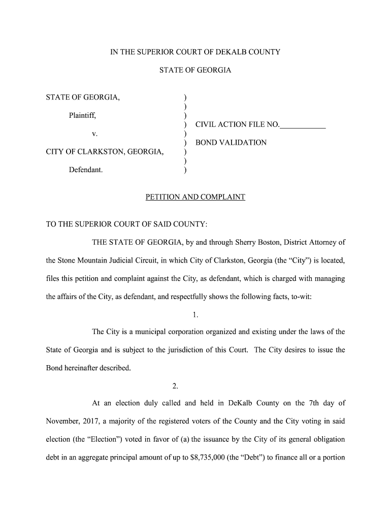 IN THE SUPERIOR COURT OF DEKALB COUNTY STATE OF GEORGIA STATE OF GEORGIA,) ))))))))Plaintiff, v. CITY OF CLARKSON, GEORGIA, Defendant. CIVIL ACTION FILE NO. BOND VALIDATIONPETITION AND COMPLAINT TO