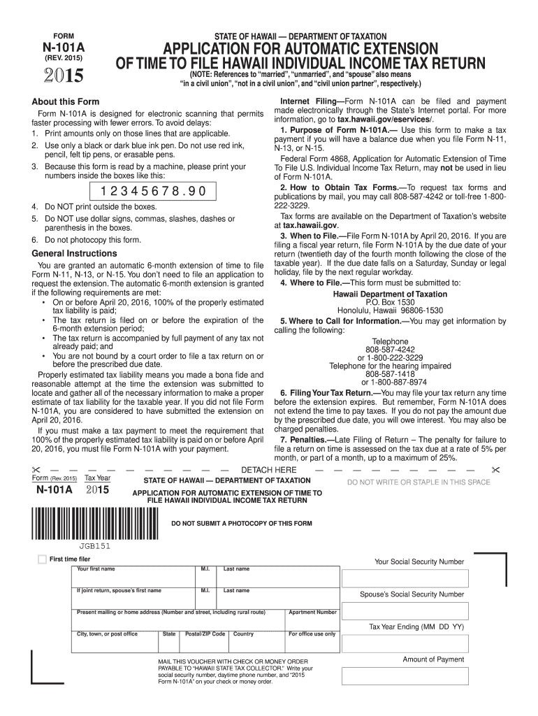 Get the free N-101A, Rev. 2015, Application for Automatic Extension of Time to File Hawaii Indivi...