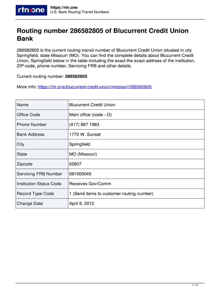 U.S. Bank Routing Transit NumbersRouting number 286582805 of Blu current Credit Union
