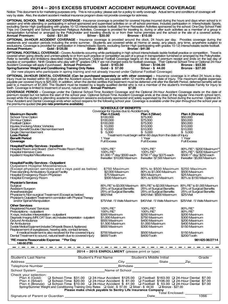 2014 2015 EXCESS STUDENT ACCIDENT INSURANCE COVERAGE Notice: This document is for marketing purposes only. This is not a policy; please ask for a policy to verify coverage. Actual terms and conditions