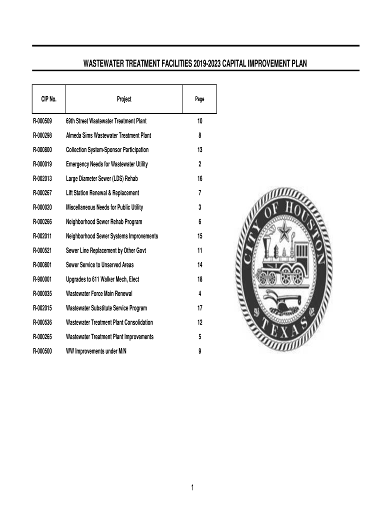 WASTEWATER TREATMENT FACILITIES 20192023 CAPITAL IMPROVEMENT PLAN CIP No. ProjectPageR00050969th Street Wastewater Treatment Plant10R000298Almeda Sims Wastewater Treatment Plant8R000800Collection