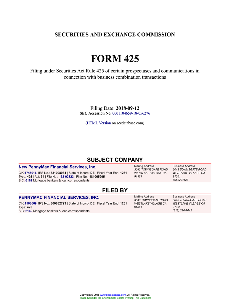 Get the free New PennyMac Financial Services, Inc. Form 425 Filed 2018-09-12. Accession Number
