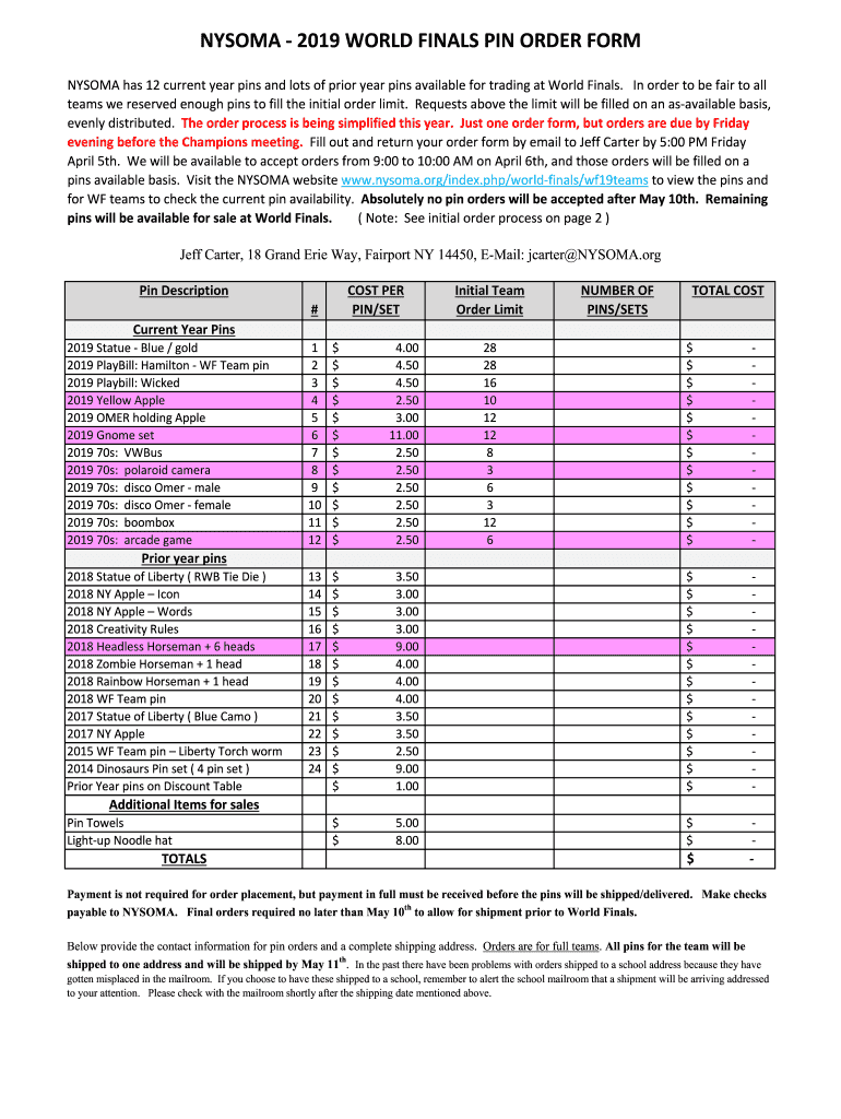 SOMA 2019 WORLD FINALS PIN ORDER FORM SOMA has 12 current year pins and lots of prior year pins available for trading at World Finals. In order to be fair to all teams we reserved enough pins to fill