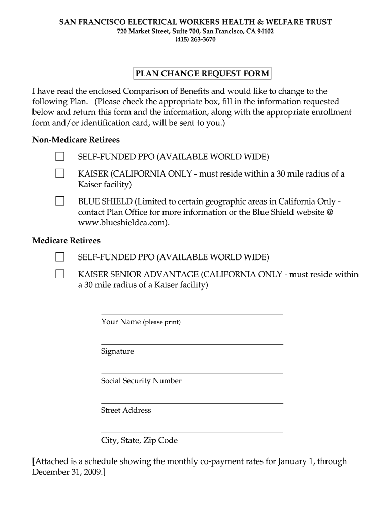SAN FRANCISCO ELECTRICAL WORKERS HEALTH & WELFARE TRUST 720 Market Street, Suite 700, San Francisco, CA 94102 (415) 263-3670 PLAN CHANGE REQUEST FORM I have read the enclosed Comparison of Benefits