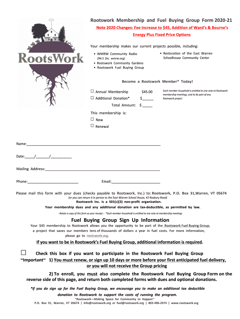 RootsworkMembershipandFuelBuyingGroupForm 202021Note 2020 Changes: Fee increase to $45, Addition of Wards & BournesEnergy Plus Fixed Price OptionsYourmembershipmakesourcurrentprojectspossible, including:RestorationoftheEastWarrenWMRWCommunityRadioSchoolhouseCommunityCenter