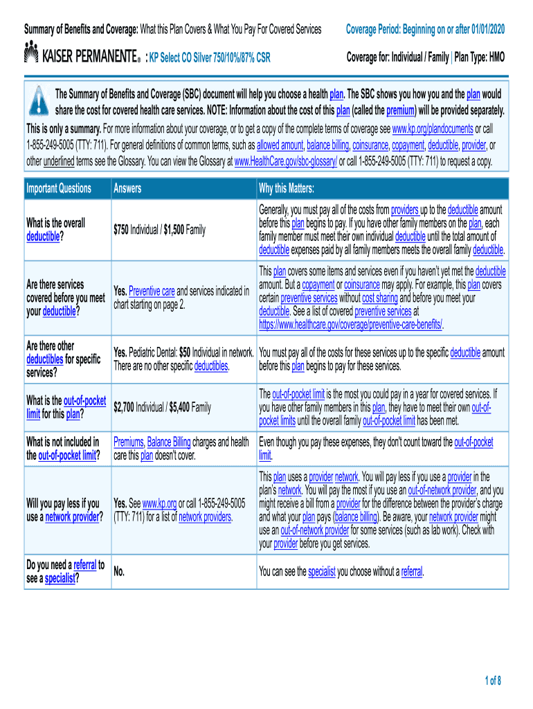 Summary of Benefits and Coverage: What this Plan Covers & What You Pay For Covered Services: KP Select CO Silver 750/10%/87% Coverage Period: Beginning on or after 01/01/2020 Coverage for: Individual