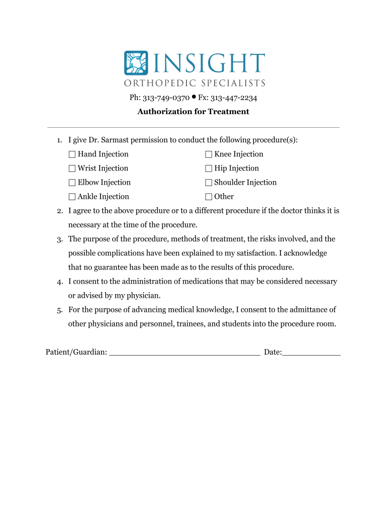 PH: 3137490370 FX: 3134472234 Authorization for Treatment 1. I give Dr. Warmest permission to conduct the following procedure(s): Hand Injection Knee Injection Wrist Injection Hip Injection Elbow