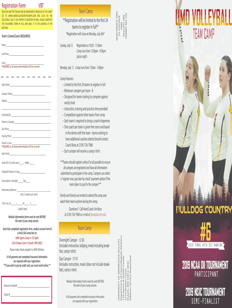 Team CampRegister and Pay Online and be Immediately Enrolled in the Camp! Go to www.umdbulldogsportcamps.com and click on the Volleyball tab. If you prefer to register by mail, please complete the