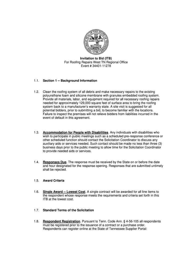 Invitation to Bid (ITB) For Roofing Repairs West TN Regional Office Event # 34401112781.1. Section 1 Background Information1.2. Clean the roofing system of all debris and make necessary repairs to