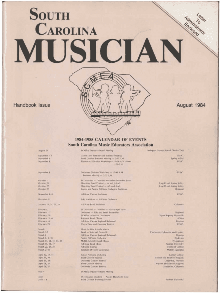SOUTH CAROLINAMUSICIAN Handbook Issue August 198419841985 CALENDAR OF EVENTS South Carolina Music Educators Association August 25SCMEA Executive Board Meeting September 78 September 8 September 8Choral