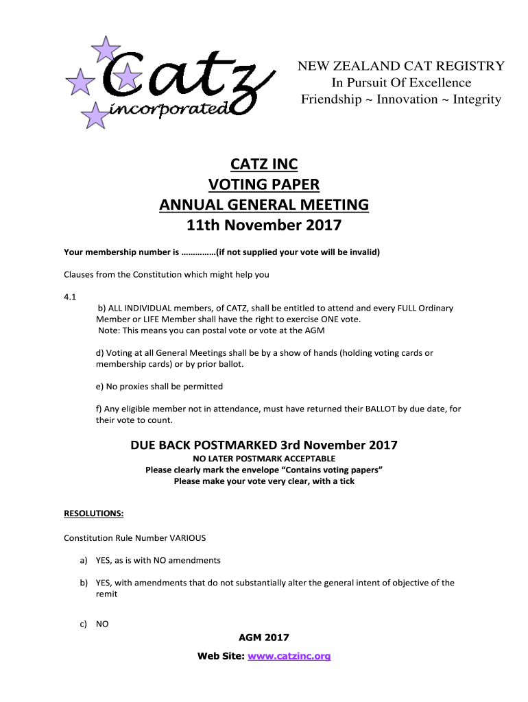 NEW ZEALAND CAT REGISTRY In Pursuit Of Excellence Friendship Innovation IntegrityCATZ INC VOTING PAPER ANNUAL GENERAL MEETING 11th November 2017 Your membership number is (if not supplied your vote