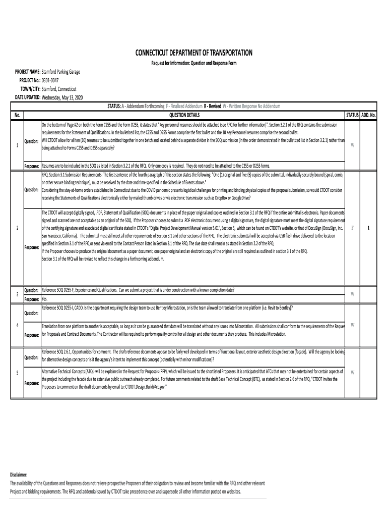 CONNECTICUT DEPARTMENT OF TRANSPORTATION Request for Information: Question and Response Form PROJECT NAME: PROJECT No.: TOWN/CITY: DATE UPDATED:Stamford Parking Garage 03010047 Stamford, Connecticut