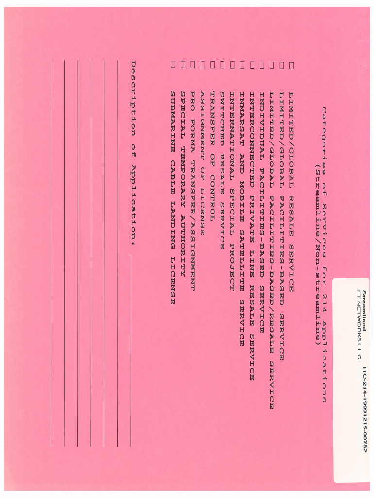 FT NETWORKS L.L.C. Categories of Services for 214 Applications