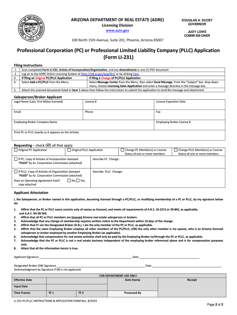 Professional Corporation (PC)/ Professional Limited Liability Company (LLC) (LI231) Instructions and Application SUBMIT APPLICATION FORM (PAGE 2) THROUGH They ARE ONLINE LICENSING SYSTEM AT https://ptl.az.gov/app/dre/