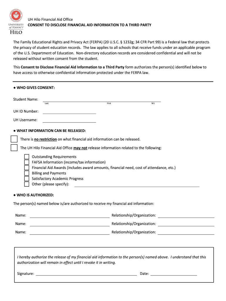 Pronuclear FormUHHiloFinancialAidOffice CONSENTTODISCLOSEFINANCIALAIDINFORMATIONTOATHIRDPARTY TheFamilyEducationalRightsandPrivacyAct(FER PA)(20U. S.C.1232g;34CFRPart99)isaFederallawthatprotects theprivacyofstudenteducationrecords.
