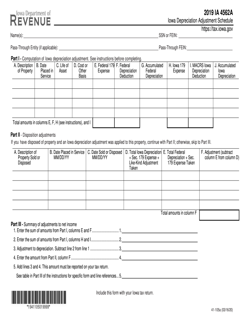 2019 IA 4562A Iowa Depreciation Adjustment Schedule https://tax.iowa.gov Name(s): SSN or VEIN: Walkthrough Entity (if applicable): Walkthrough VEIN: Part I Computation of Iowa depreciation adjustment.