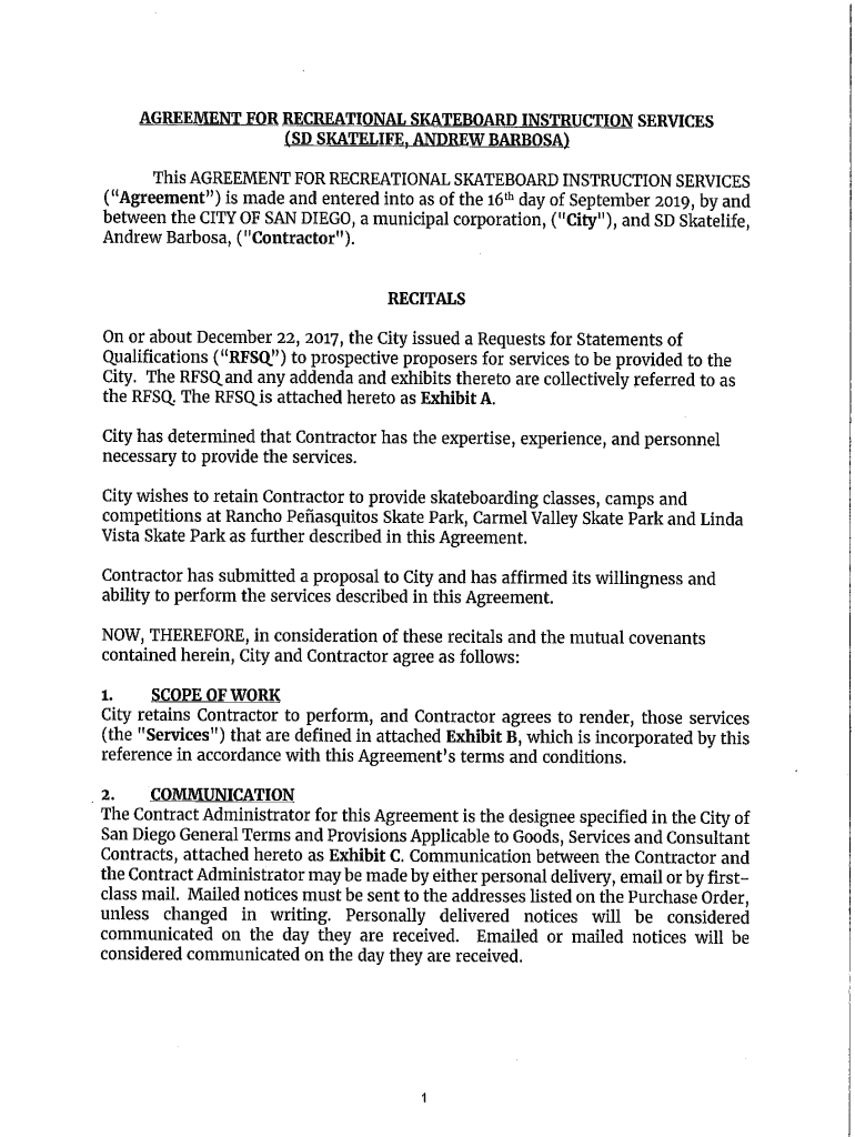 AGREEMENT FOR RECREATIONAL SKATEBOARD INSTRUCTION SERVICES (SD SATELLITE, ANDREW BARBOSA)This AGREEMENT FOR RECREATIONAL SKATEBOARD INSTRUCTION SERVICES (“Agreement “) is made and entered into