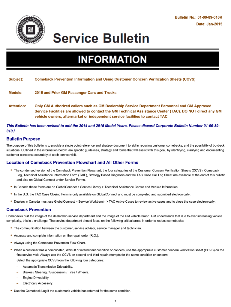 Date: Jan2015Subject:Comeback Prevention Information and Using Customer Concern Verification Sheets (CCS)Models:2015 and Prior GM Passenger Cars and TrucksAttention:Only GM