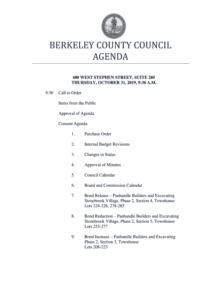 BERKELEY COUNTY COUNCIL AGENDA 400 WEST STEPHEN STREET, SUITE 205 THURSDAY, OCTOBER 31, 2019, 9:30 A.M. 9:30Call to Order Items from the Public Approval of Agenda Consent Agenda 1. Purchase Order2.