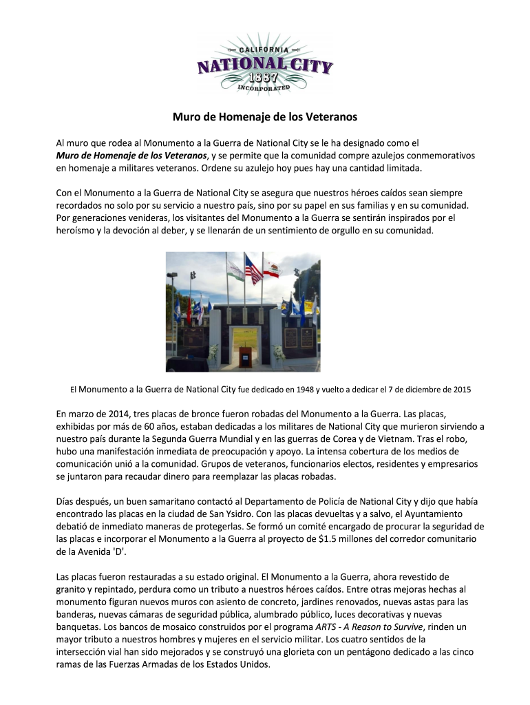 Get the free Al muro que rodea al Monumento a la Guerra de National City se le ha designado como el