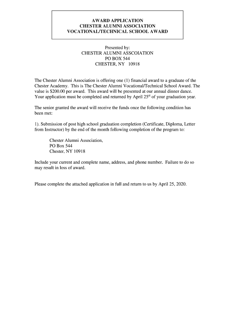 CHESTER, NY 10918The Chester Alumni Association is offering one (1)