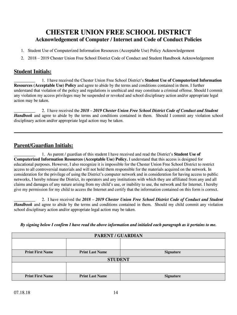 CHESTER UNION FREE SCHOOL DISTRICT Acknowledgement of Computer / Internet and Code of Conduct Policies 1. Student Use of Computerized Information Resources (Acceptable Use) Policy Acknowledgement