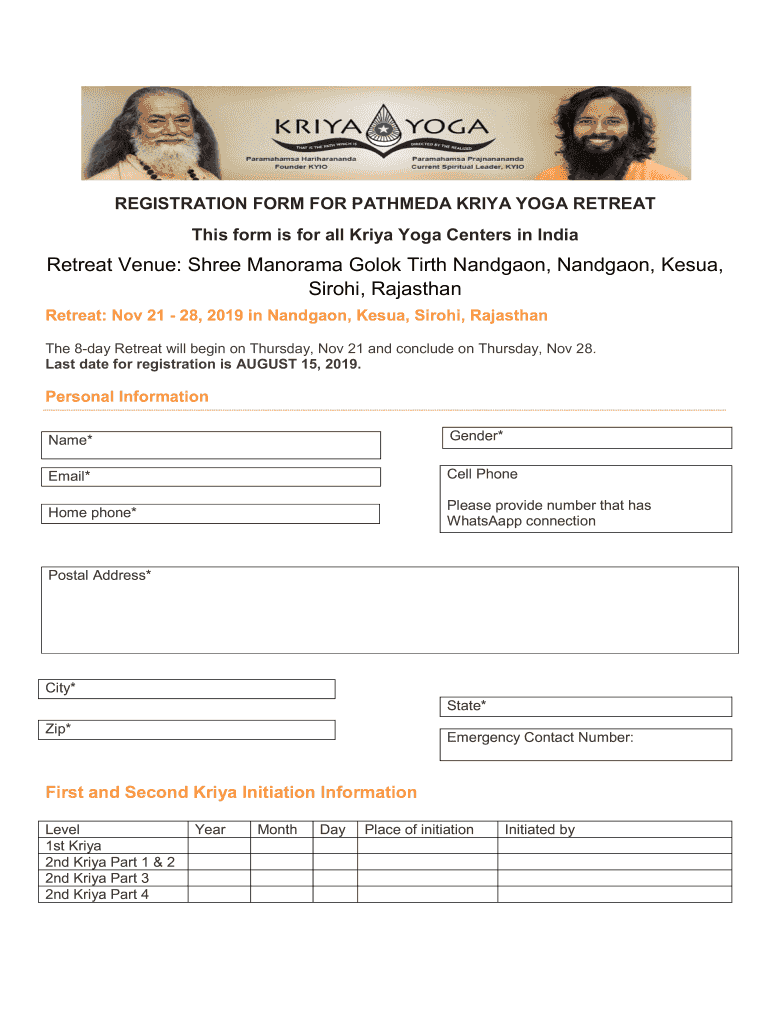 REGISTRATION FORM FOR AHMED ORIYA YOGA RETREAT This form is for all Oriya Yoga Centers in IndiaRetreat Venue: Three Panorama Gook Birth Handgun, Handgun, Jesus, Sindhi, Rajasthan Retreat: Nov 21 28,