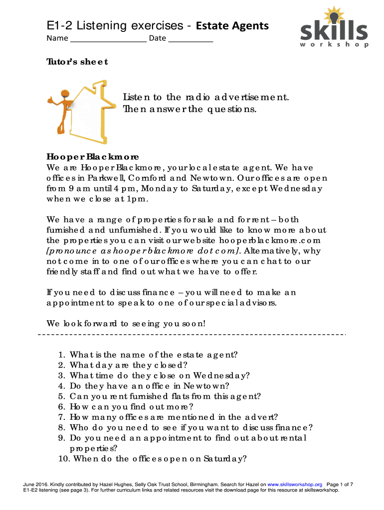 E12 Listening exercises Statements Name Date Tutors sheet Listen to the radio advertisement. Then answer the questions. Hooper Blackmore We are Hooper Blackmore, your local estate agent. We have offices