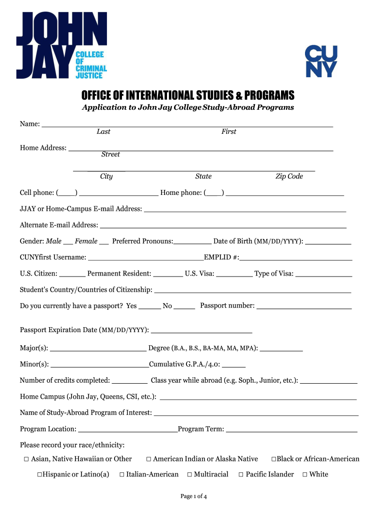 CUNY John Jay College of Criminal Justice Application to Study-Abroad Programs 2019-2026 free printable template
