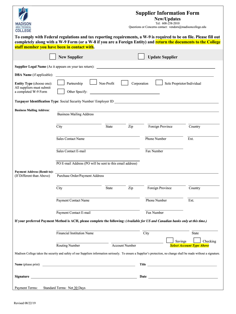 Questions or Concerns contact: vendors@madisoncollege.eduTo comply with Federal regulations and tax reporting requirements, a W9 is required to be