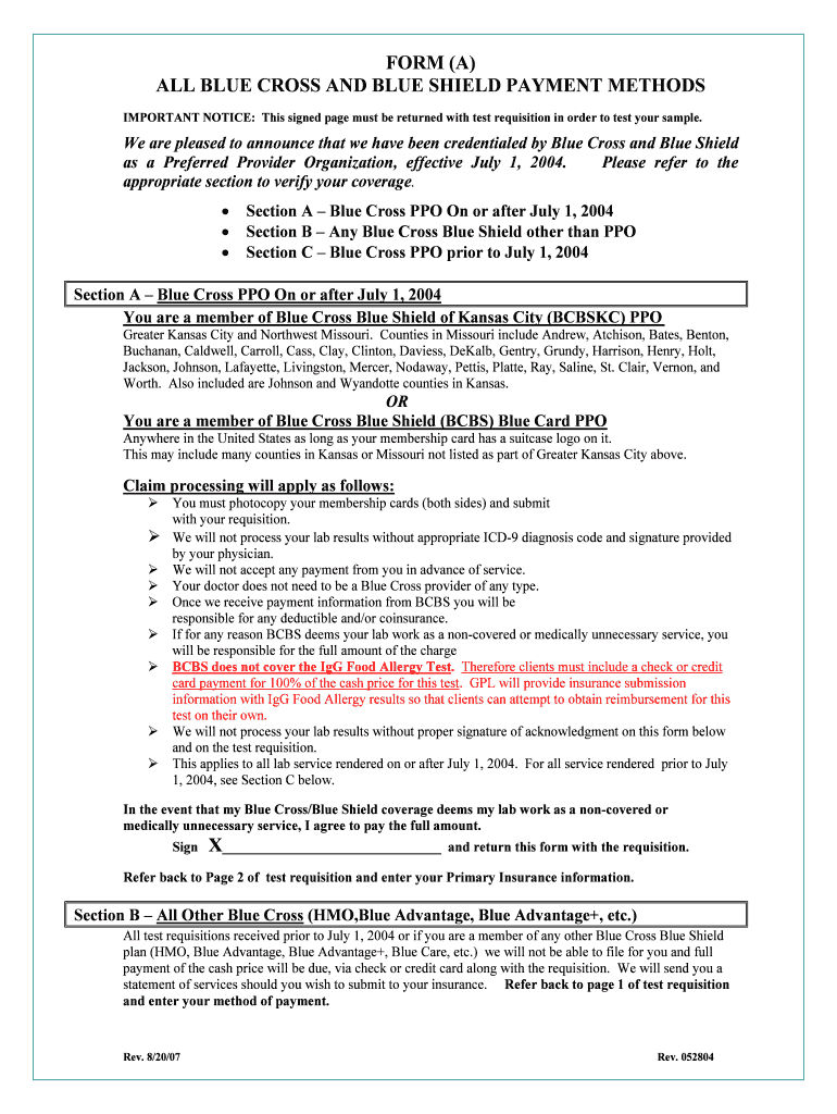 FORM (A) ALL BLUE CROSS AND BLUE SHIELD PAYMENT METHODS IMPORTANT NOTICE: This signed page must be returned with test requisition in order to test your sample. We are pleased to announce that we have