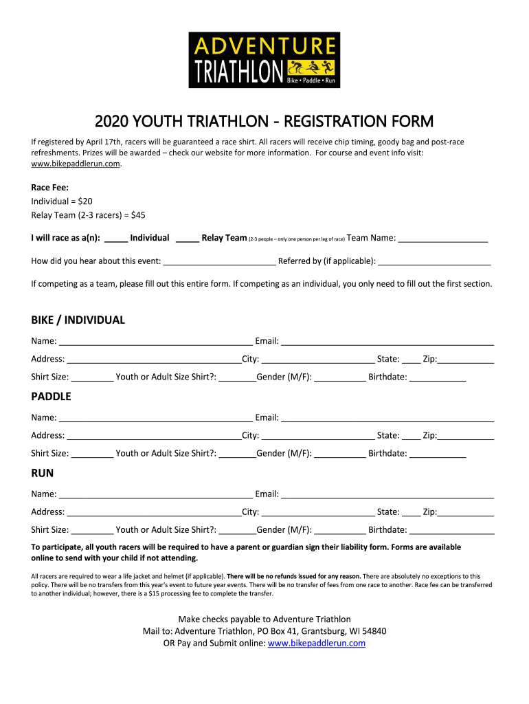 To fill out the 2020 youth triathlon entry form, follow these steps: