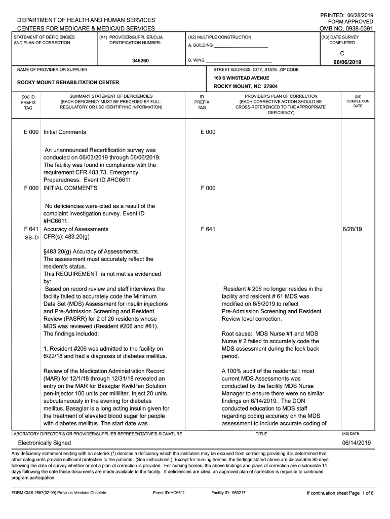 PRINTED: 06/28/2019 FORM APPROVEDDEPARTMENT OF HEALTH AND HUMAN SERVICES CENTERS FOR MEDICARE & MEDICAID SERVICES STATEMENT OF DEFICIENCIES AND PLAN OF CORRECTION(X1) PROVIDER/SUPPLIER/CIA IDENTIFICATION