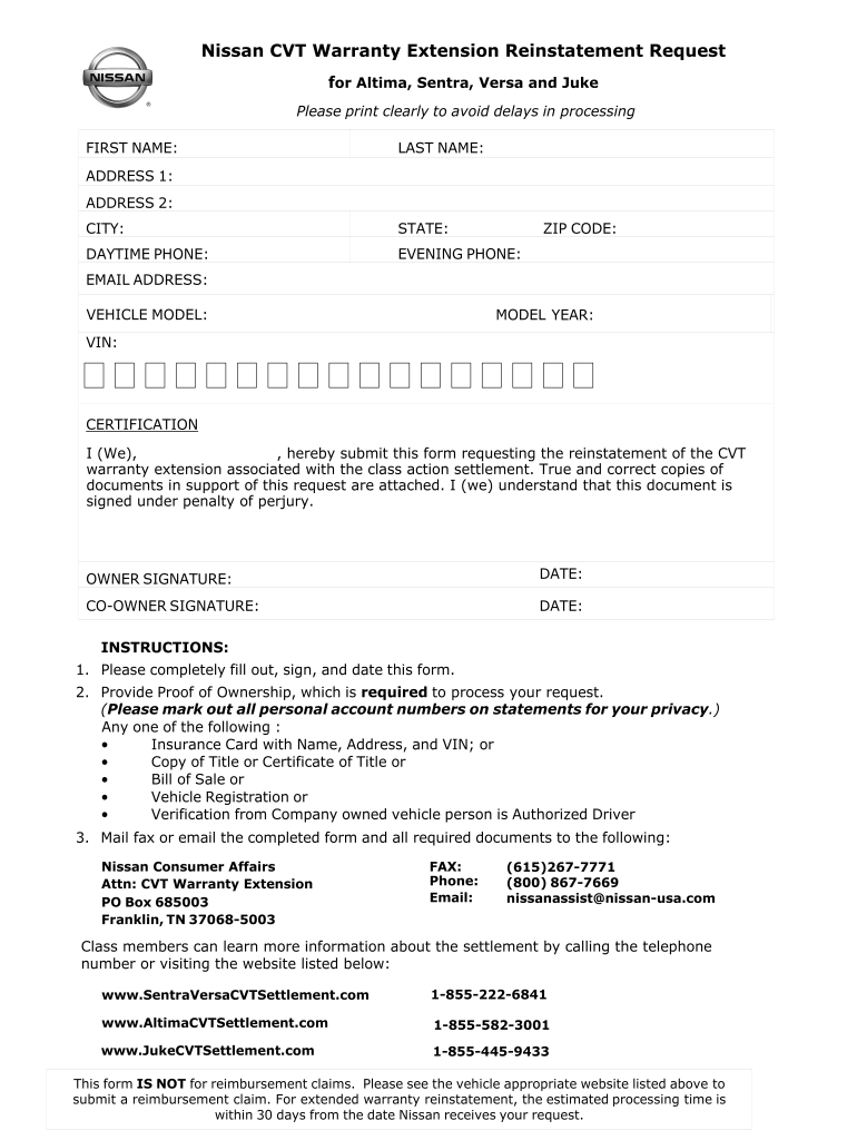 Nissan CVT Warranty Extension Reinstatement Request
