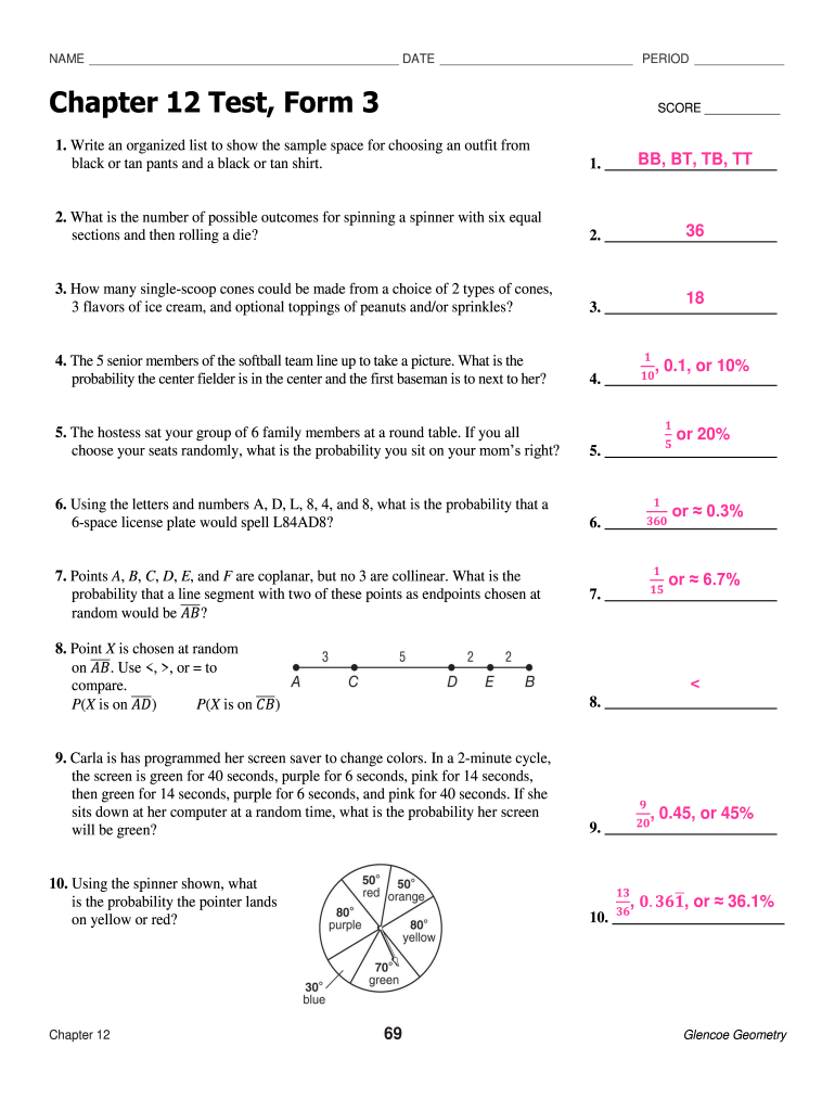 NAME DATE PERIOD Chapter 12 Test, Form 3SCORE 1. Write an organized list to show the sample space for choosing an outfit from black or tan pants and a black or tan shirt. BB, BT, TB, TT 1. 2. What