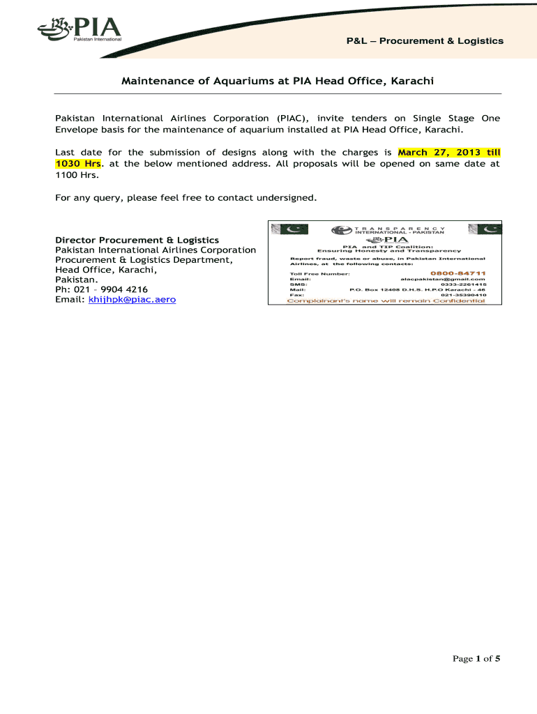 P&L Procurement & Logistics Maintenance of Aquariums at PIA Head Office, Karachi Pakistan International Airlines Corporation (PAC), invite tenders on Single Stage One Envelope basis for the maintenance