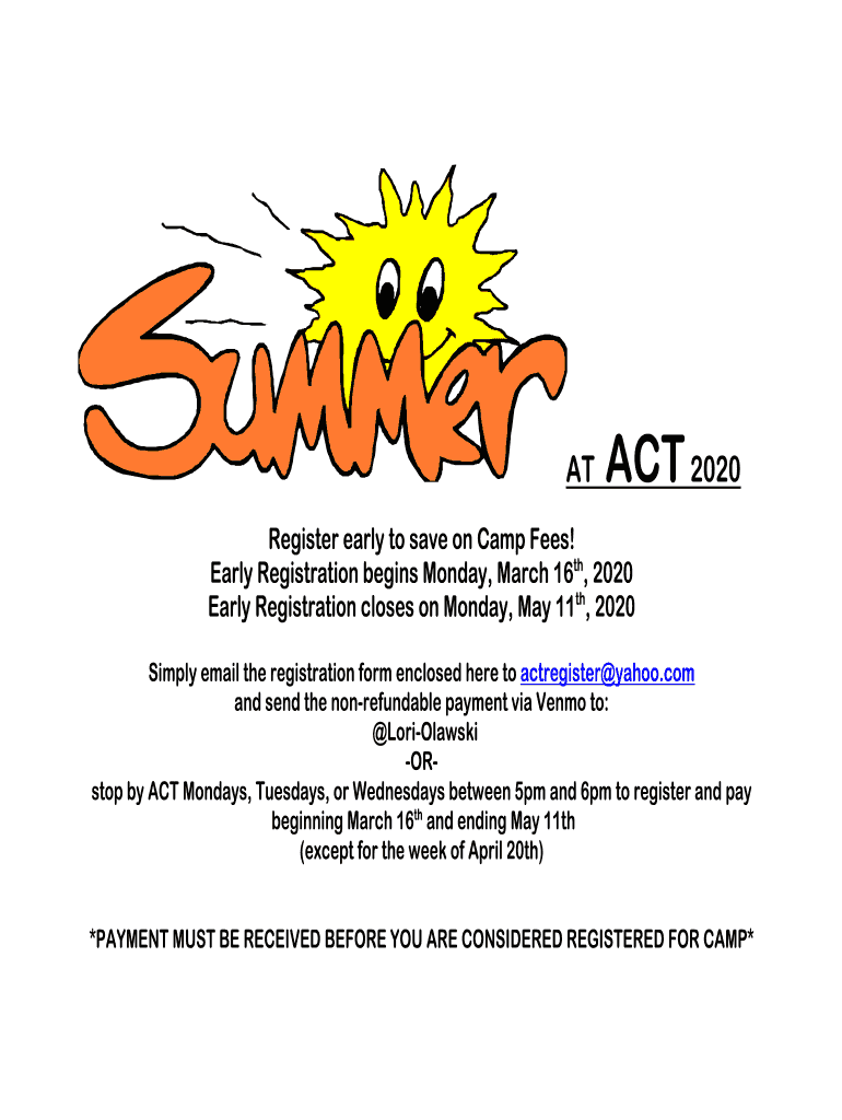 TACT 2020Register early to save on Camp Fees! Early Registration begins Monday, March 16th, 2020 Early Registration closes on Monday, May 11th, 2020 Simply email the registration form enclosed here