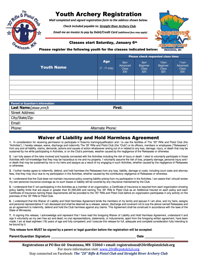 Youth Archery Registration Mail completed and signed registration form to the address shown below. Check included payable to: Straight River Archery Club. Email me an invoice to pay by Debit/Credit