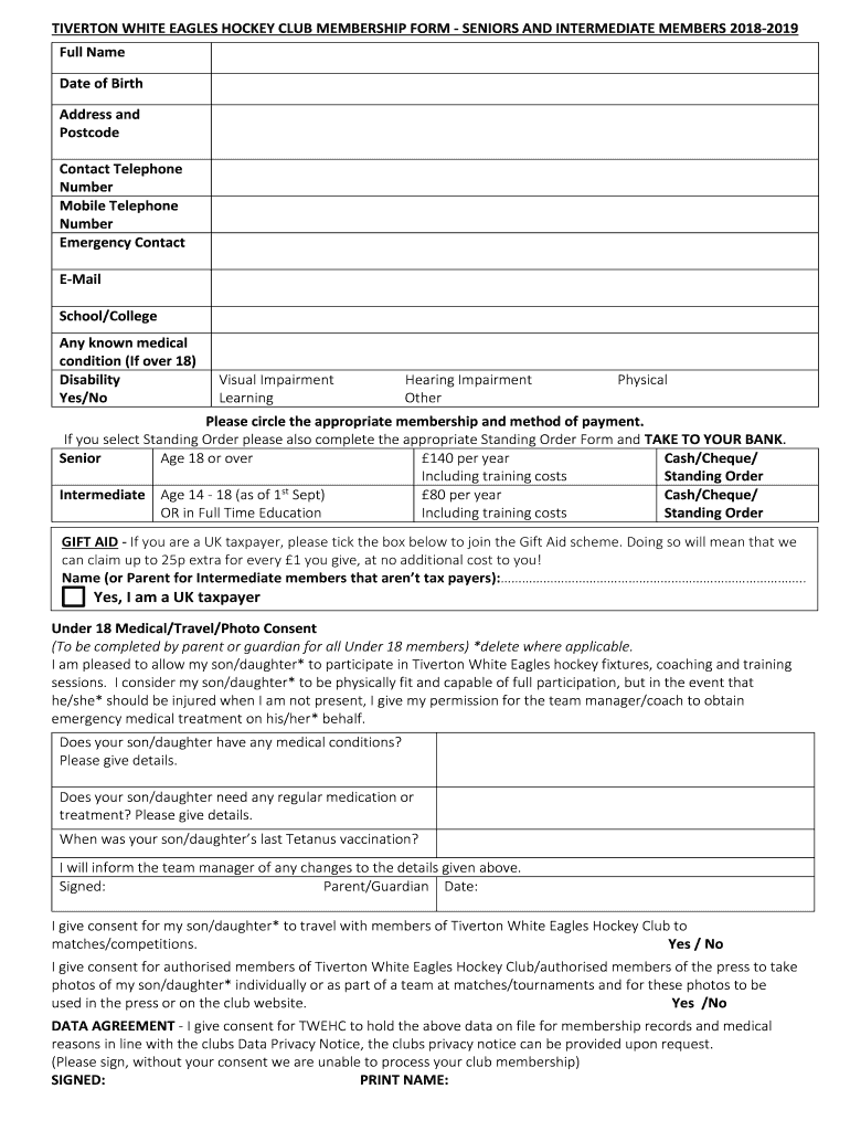 RIVERTON WHITE EAGLES HOCKEY CLUB MEMBERSHIP FORM SENIORS AND INTERMEDIATE MEMBERS 20182019 Full Name Date of Birth Address and Postcode Contact Telephone Number Mobile Telephone Number Emergency
