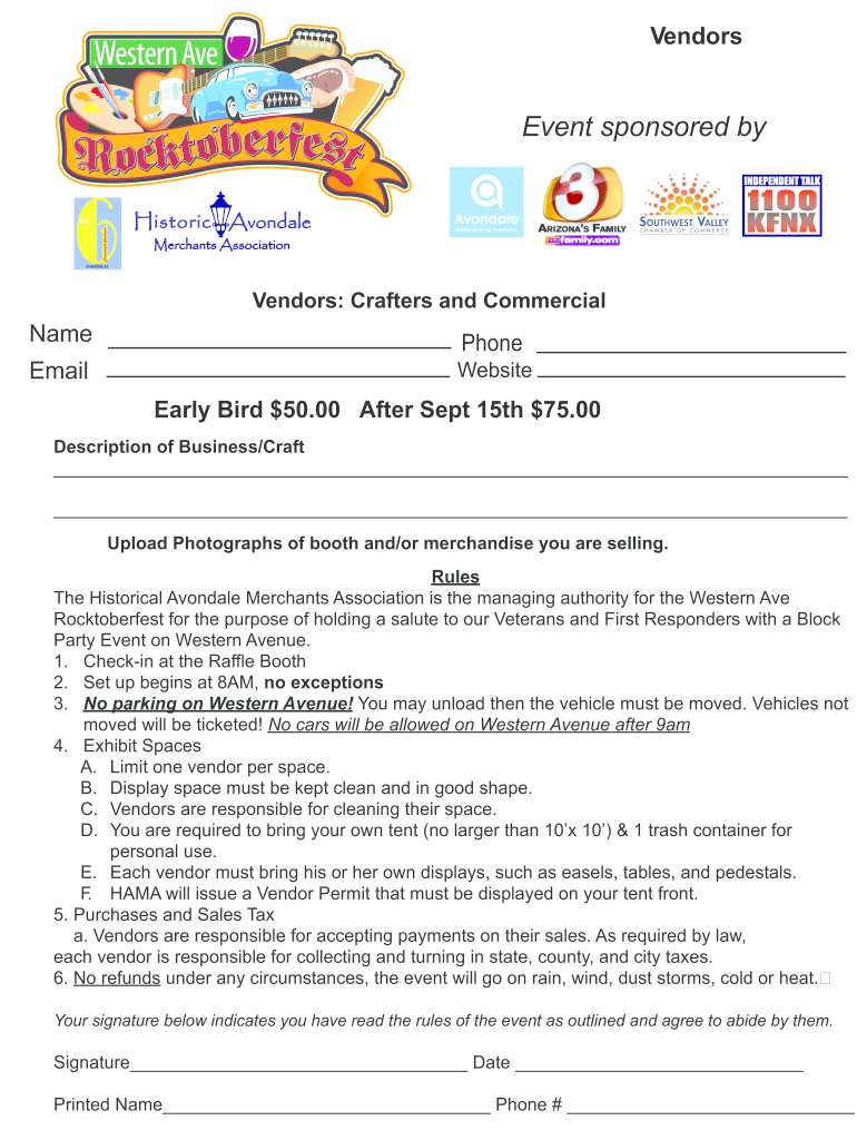 Endorsement sponsored vendors: Craters and Commercialism Phone Email Website Early Bird $50.00 After Sept 15th $75.00 Description of Business/Craft Upload Photographs of booth and/or merchandise you