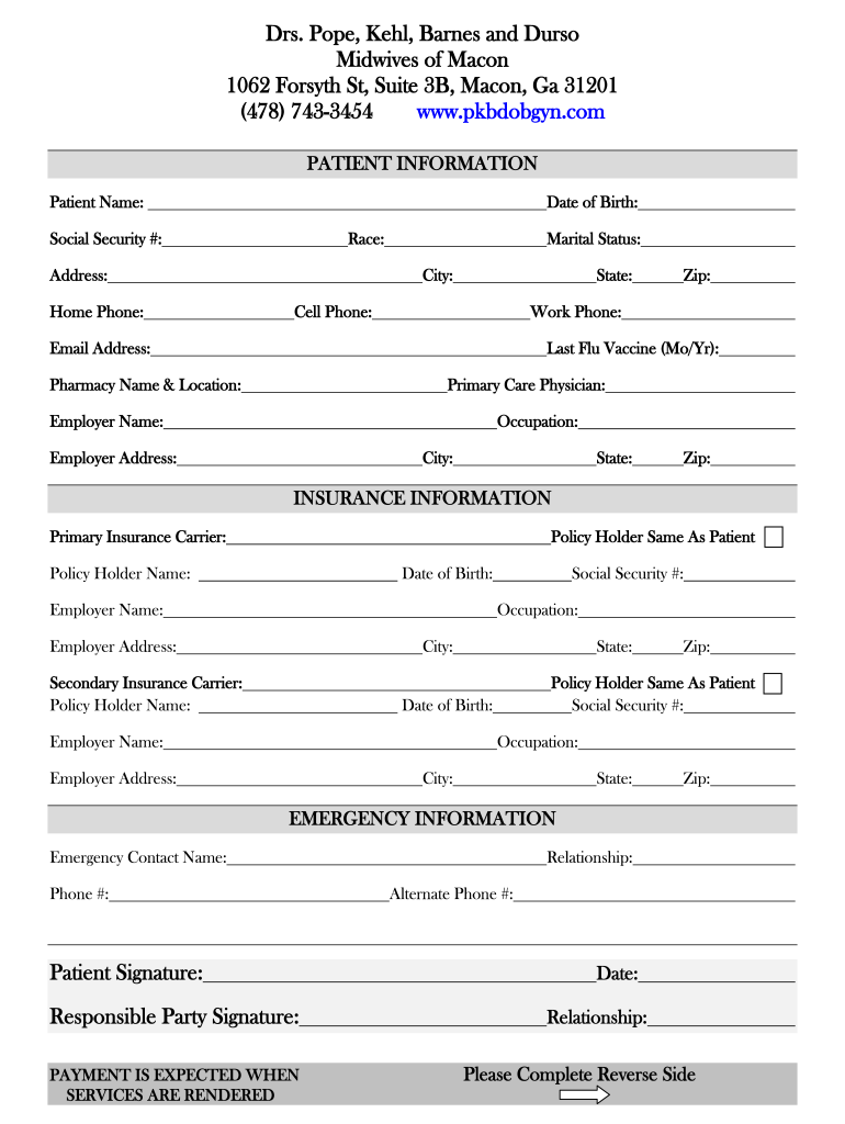 DRS. Pope, Keel, Barnes and Durst Midwives of Macon 1062 Forsyth St, Suite 3B, Macon, Ga 31201 (478) 7433454 www.pkbdobgyn.com PATIENT INFORMATION Patient Name:Date of Birth:Social Security #:Race:Address: